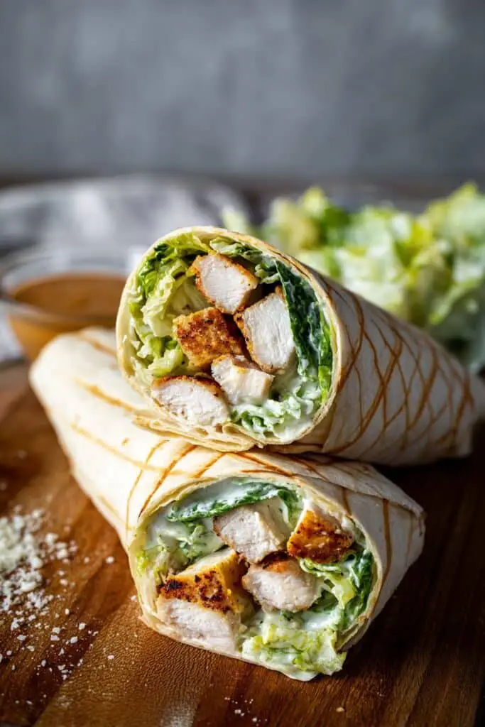 This is one of the easiest and most loved chicken wraps ever. It tastes just like a Caesar salad, but it’s rolled into a soft tortilla which makes it perfect for office lunches, school lunches, or anytime you want something fast but filling.