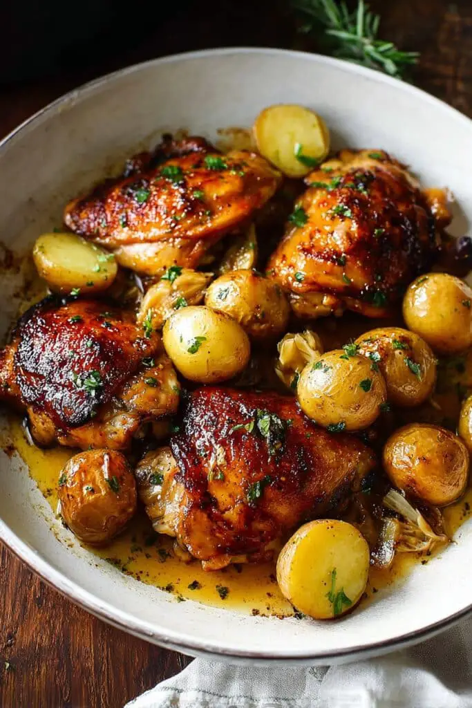 Bake for 40–45 minutes, or until the chicken skin is golden and potatoes are crisp.