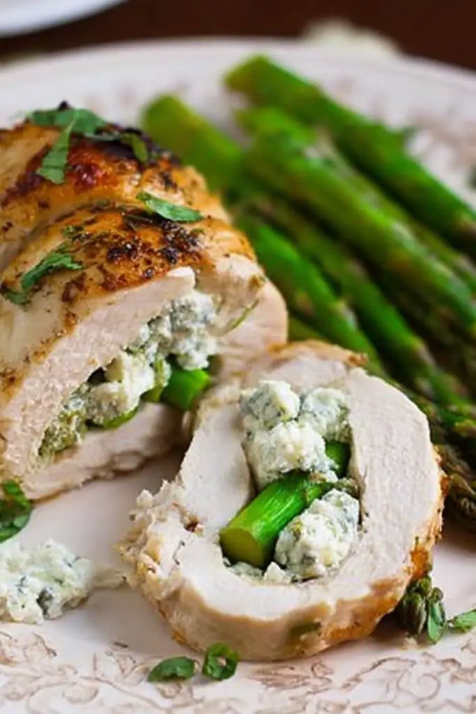 - Mix goat cheese, garlic, and herbs, then stuff into each chicken breast with asparagus spears.