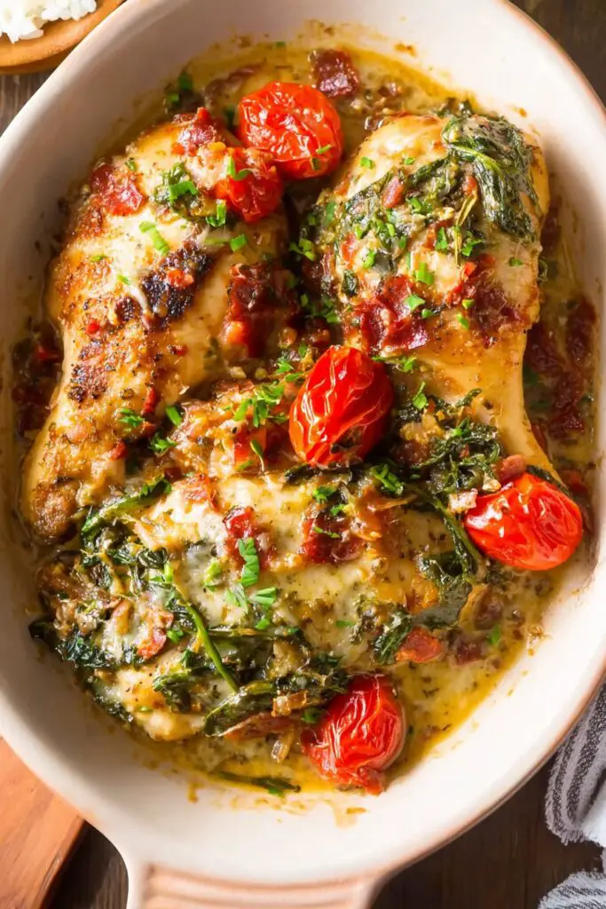 - Assemble the casserole: Place the chicken in the baking dish. Scatter sun-dried tomatoes and baby spinach over and around the chicken. Pour heavy cream evenly over everything. Sprinkle Parmesan and mozzarella on top, adding red pepper flakes if you like a little kick.