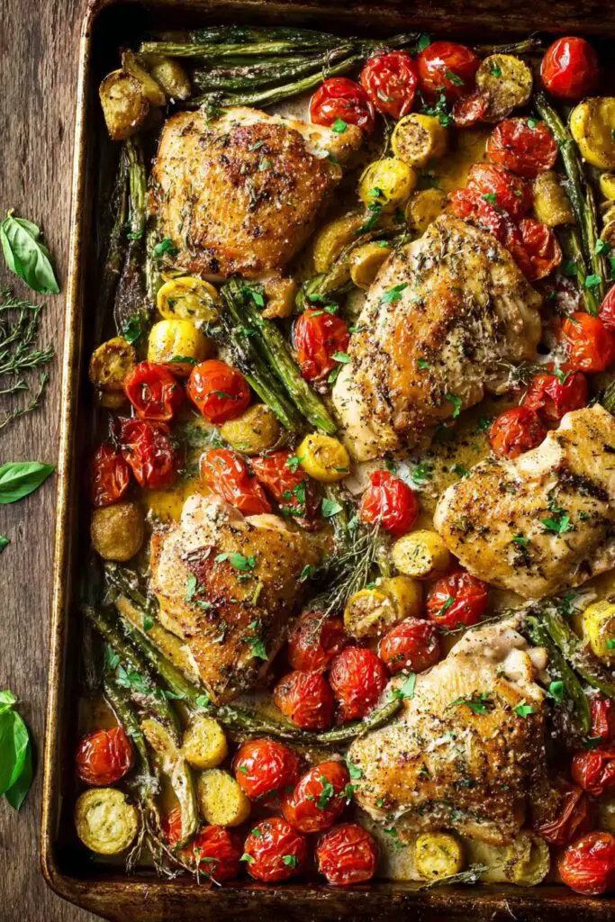 - Bake: Roast for 25–30 minutes, flipping the vegetables halfway through. The chicken should reach an internal temperature of 165°F (74°C) and the vegetables should be tender.