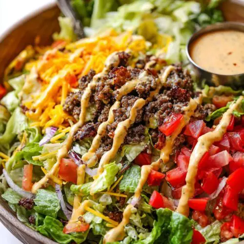 Add the warm beef over the salad. Sprinkle the shredded cheese on top so it slightly melts. Drizzle generously with the cheeseburger salad dressing.