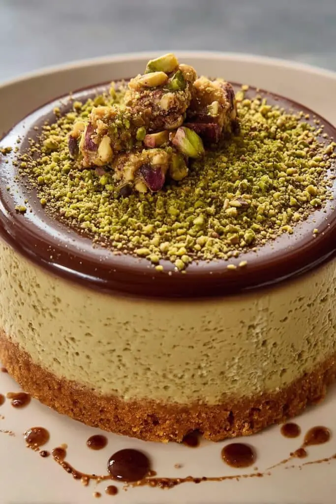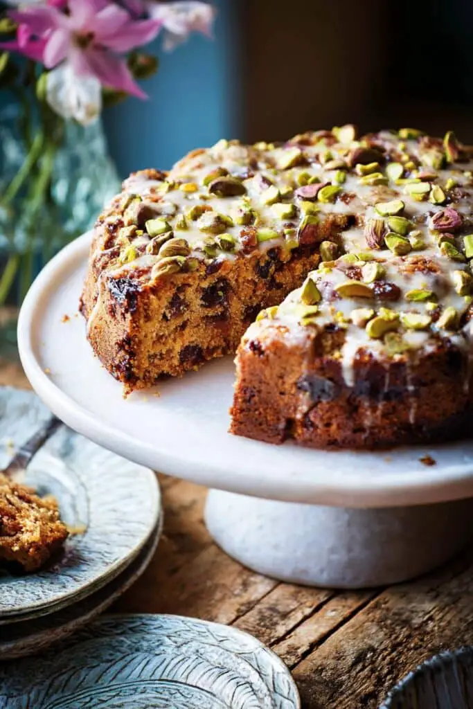 Before serving, garnish with extra pistachios, date slices, or a drizzle of honey or chocolate. Slice and enjoy!