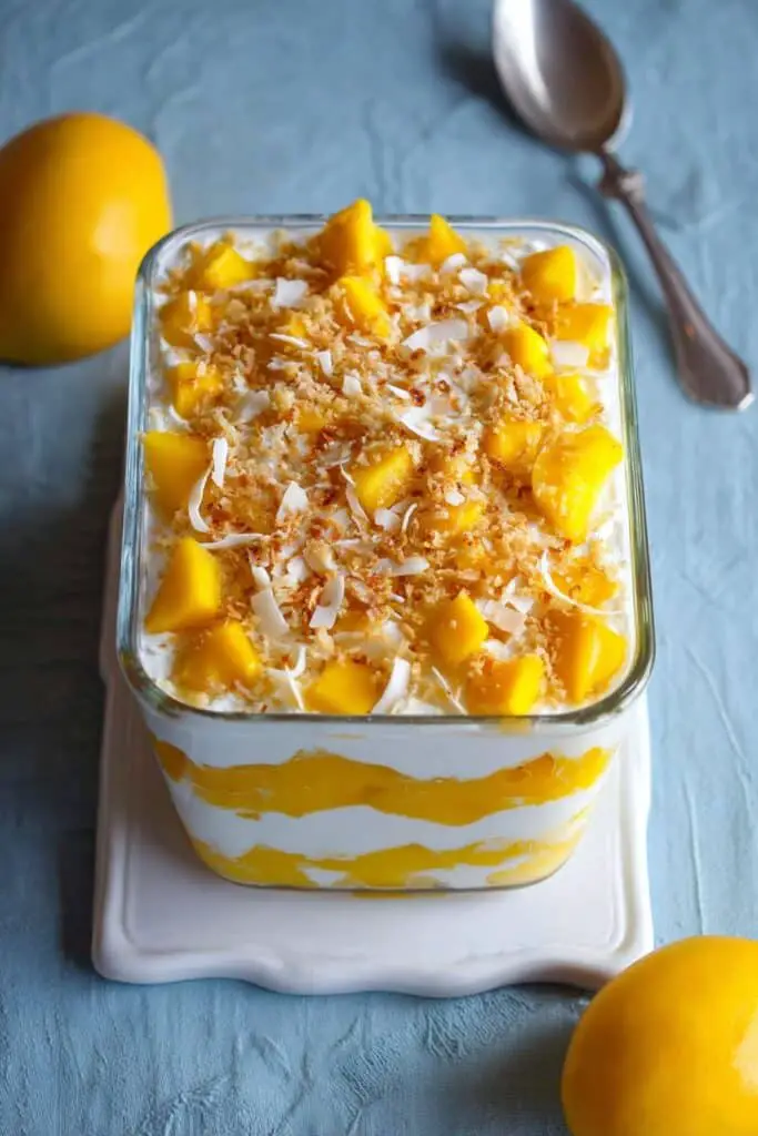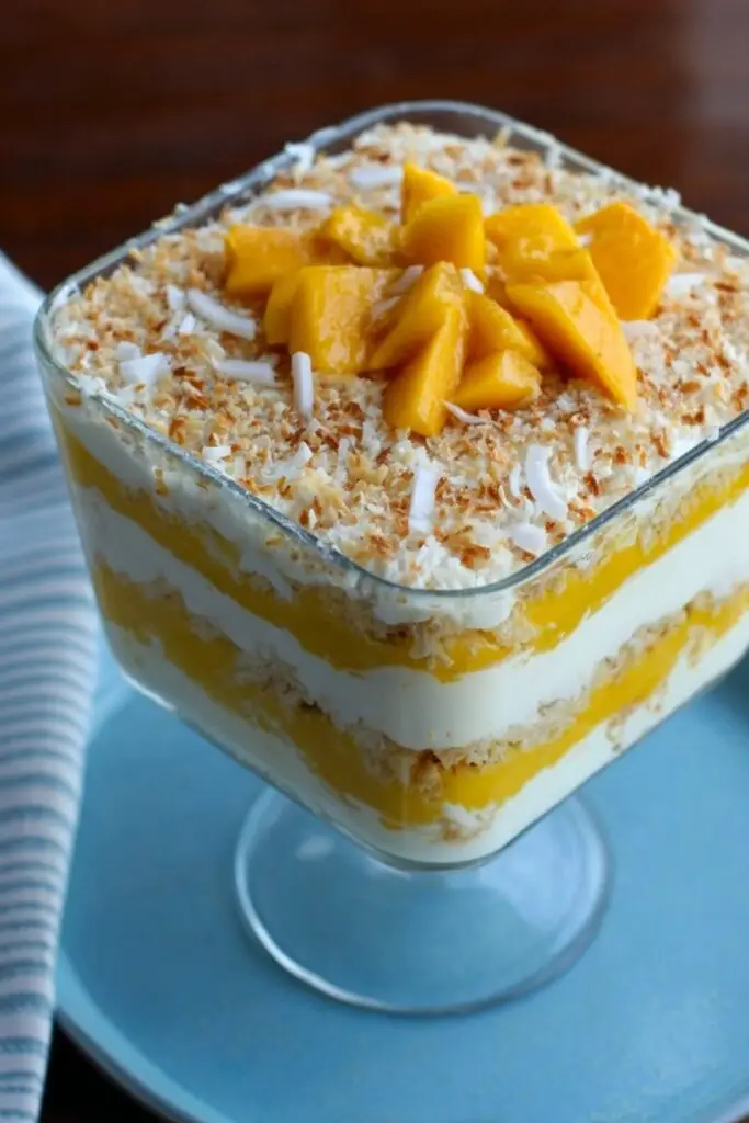 - Repeat layers and finish with cream, mango, and coconut topping.