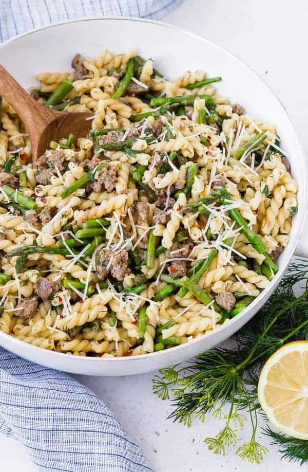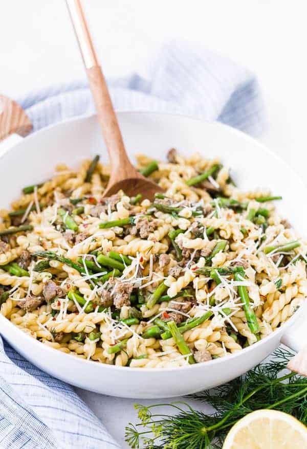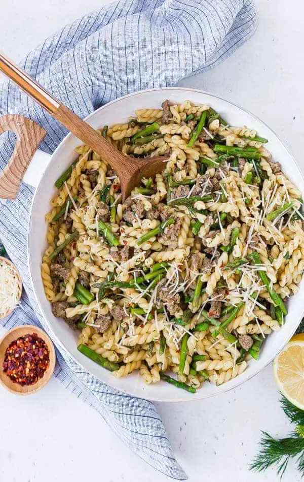 One Pan Lemon Pasta with Sausage, Asparagus, and Dill