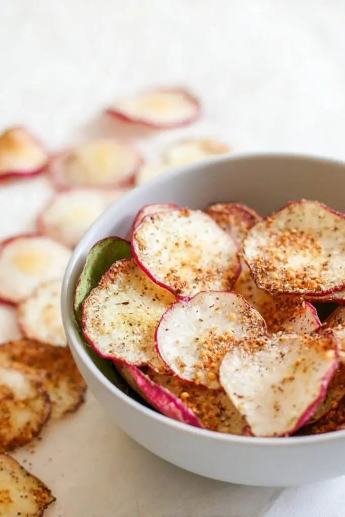 These crispy radish chips are perfect next to grilled chicken, baked fish, or even a simple omelet. They add a light, crunchy element that balances heavier dishes nicely.