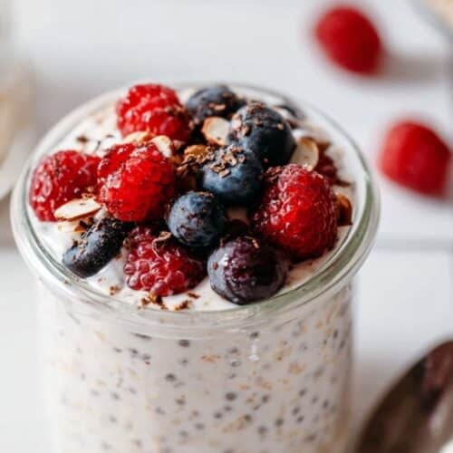 A small spoonful about a teaspoon or two adds extra nutrition and helps thicken the oats. They absorb liquid overnight and give the mixture a pudding-like consistency. Look for small, dark seeds that are dry and free-flowing. If you don’t have chia seeds, you can skip them or use ground flaxseed instead.