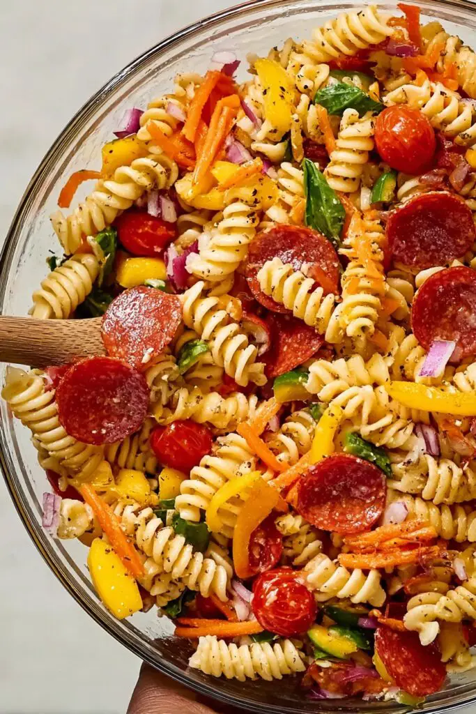 This is where the creamy element comes in. Mayo forms the base, giving you that pepperoni pasta salad with mayo feel. You can lighten it with a little Italian dressing or a splash of vinegar if you like contrast.