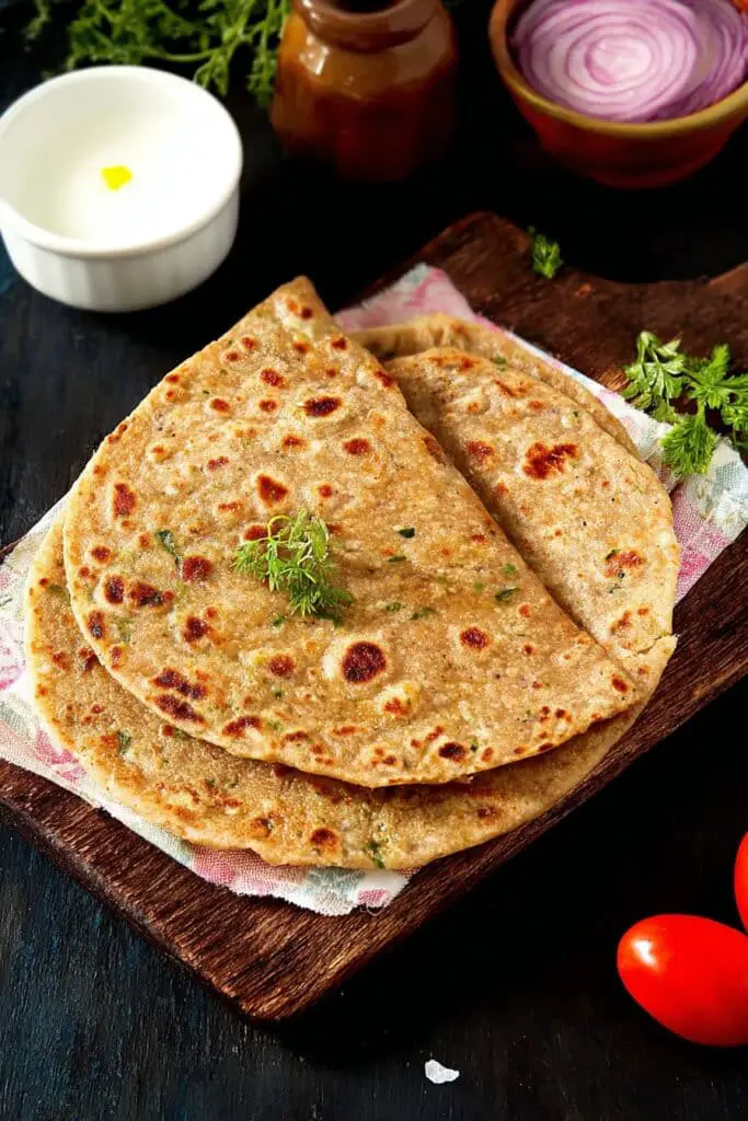 - Cook each paratha for 2–3 minutes on each side, brushing lightly with oil or ghee until golden and cooked through.