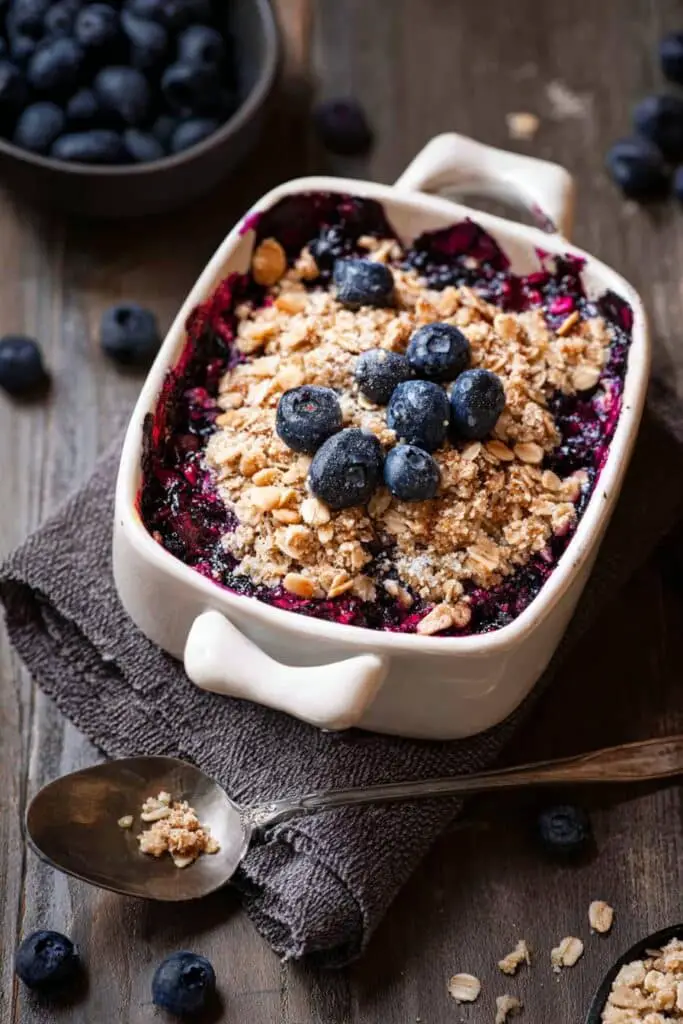 5. Bake: Place in the oven and bake for 25–30 minutes, until the topping is golden and the blueberry juices are bubbling.