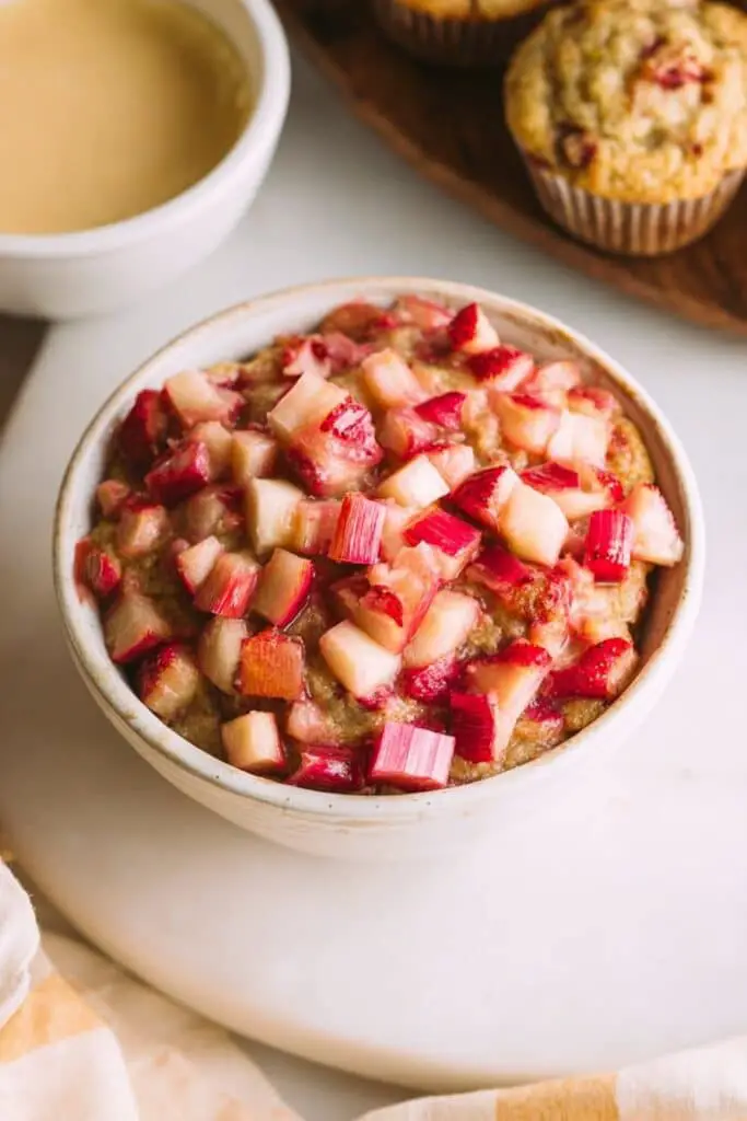 You’ll use about ¾ cup of regular granulated sugar for the batter. It balances the tartness of the rhubarb and helps create a soft texture. For a deeper flavor, you can replace a few tablespoons with brown sugar.