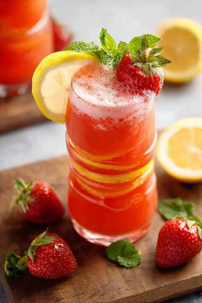 I always like to end my Super Bowl beverages drink recipes with a mocktail that everyone kids, teens, and adults alike can enjoy. The Strawberry Lemon Fizz is bright, bubbly, and fruity, making it a fun and festive choice for your Super Bowl party. I personally love how the strawberries add a natural sweetness while the lemon keeps it refreshing, perfect for sipping between plays.
