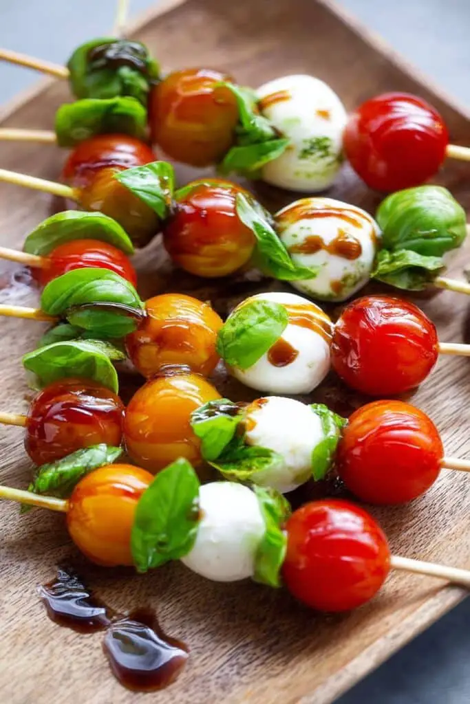 - Assemble skewers: On each toothpick, thread one cherry tomato, one basil leaf (folded if large), and one mozzarella ball. Repeat until all ingredients are used.