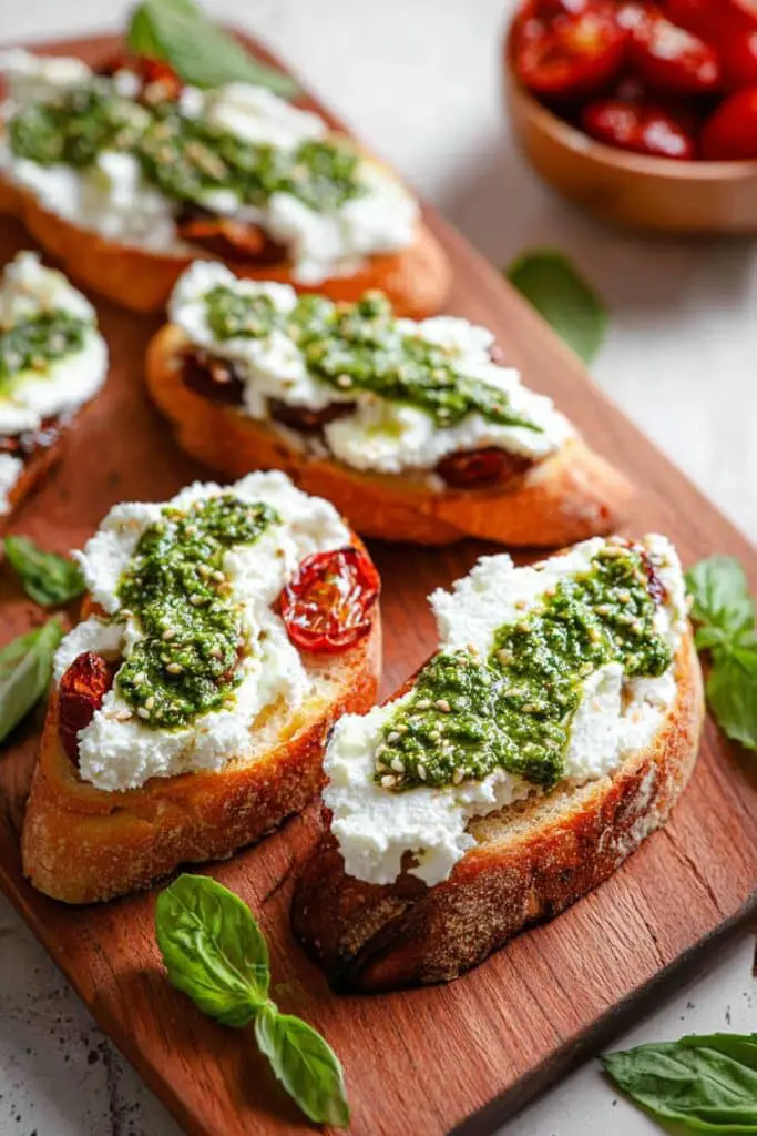 - Assemble the crostini: Spread a generous layer of ricotta on each toasted slice, then drizzle or dollop with pesto. Garnish with cherry tomatoes or basil if you like.