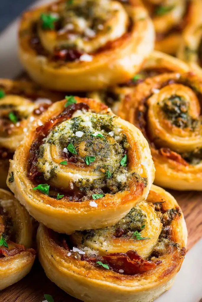 Every bite is a mix of flaky pastry, melted cheese, and bright pesto it’s like a party in your mouth!