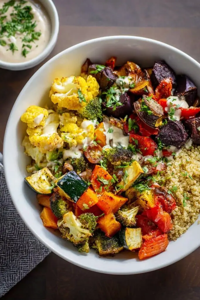 - Assemble bowl: In a serving bowl, layer cooked quinoa and roasted vegetables. Sprinkle feta and parsley on top if using.
